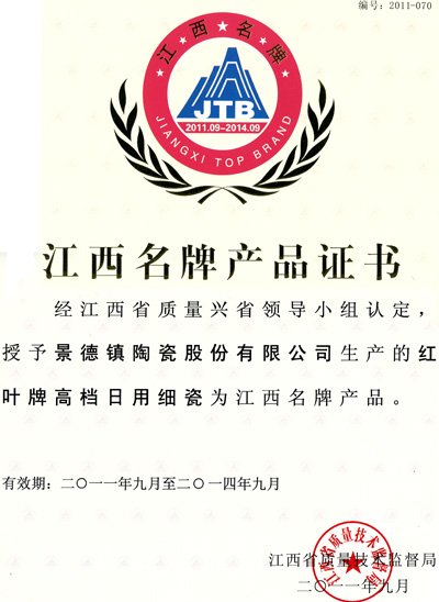 2011年10月9日在南昌召開(kāi)了2011年江西名牌產(chǎn)品及質(zhì)量管理先進(jìn)企業(yè)授牌大會(huì),“紅葉”陶瓷榮獲2011年江西名牌產(chǎn)品稱(chēng)號(hào)。