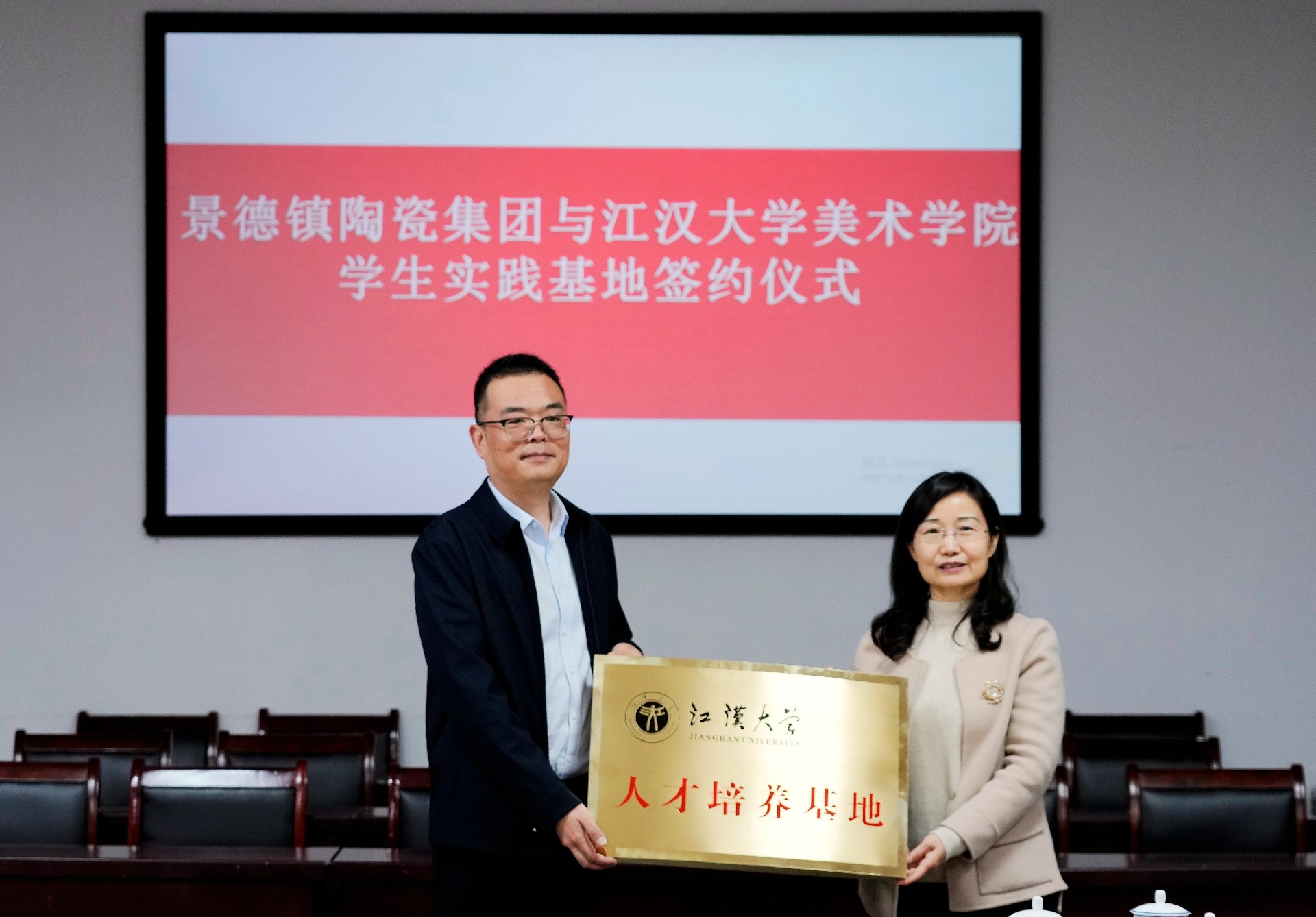 會(huì)上,舉行了江漢大學(xué)美術(shù)學(xué)院與景陶集團(tuán)“共建學(xué)生實(shí)踐基地”簽約授牌儀式。集團(tuán)人力資源部部長薛景玉、江漢大學(xué)美術(shù)學(xué)院副院長馬杰分別代表雙方初步簽訂了《校外實(shí)習(xí)基地建設(shè)協(xié)議書》,江漢大學(xué)美術(shù)學(xué)院副書記楊緒軍代表江大美院捐贈(zèng)《江漢大學(xué)美術(shù)學(xué)院畢業(yè)作品集》等書籍。