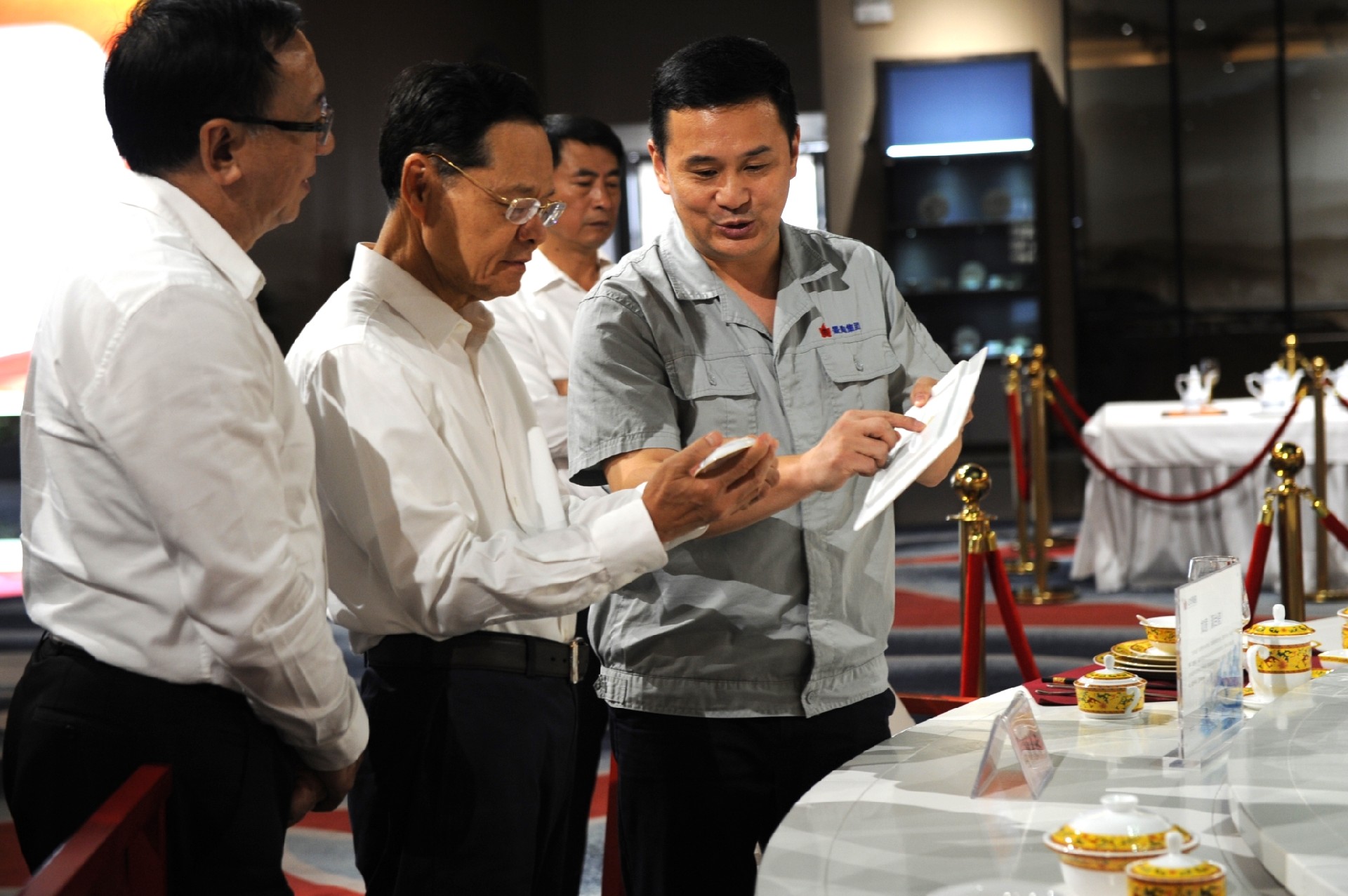 走進國瓷館,鄧景揚向陳武一行介紹了集團的基本情況,國瓷館展廳規(guī)模。鄧景揚介紹說,“國瓷館”是目前全世界最大的單一品牌陶瓷展廳。參觀時,陳武興致勃勃地拿起桌上的一套產(chǎn)品仔細端詳,鄧景揚適時介紹到:“這是我們新開發(fā)的一款產(chǎn)品,是一套組合餐具,該產(chǎn)品將日用陶瓷和藝術陶瓷巧妙結合,合起來是一個花瓶的造型?!薄斑@個不錯,有創(chuàng)意!是紅葉品牌嗎?”陳武問道?!斑@是我們集團旗下一個“百花”品牌的產(chǎn)品?!彪S即,鄧景揚向陳武介紹了景陶集團發(fā)展脈絡和以“國瓷紅葉”為主打品牌,金品陶、百花、家好系統(tǒng)品牌特色,集聚綻放的特點。期間,鄧景揚講述了“紅葉”與“御窯”前世今生的關系和如何將“紅葉”產(chǎn)業(yè)和陶瓷文化進一步做大做強制定的新的發(fā)展愿景。鄧景揚介紹道,“我們集團的發(fā)展愿景是做世界上最精美的瓷器,創(chuàng)百年一流企業(yè),讓‘紅葉’成為世界知名的日用陶瓷中國民族品牌,用陶瓷講好中國故事,展中華文化風采,讓‘紅葉’成為中華文化走向世界的文明使者?!标愇渎牶蟊硎臼终J可和贊同,并勉勵景陶集團進一步發(fā)揮好景德鎮(zhèn)陶瓷龍頭企業(yè)的帶頭作用,讓紅葉陶瓷真正走出去。